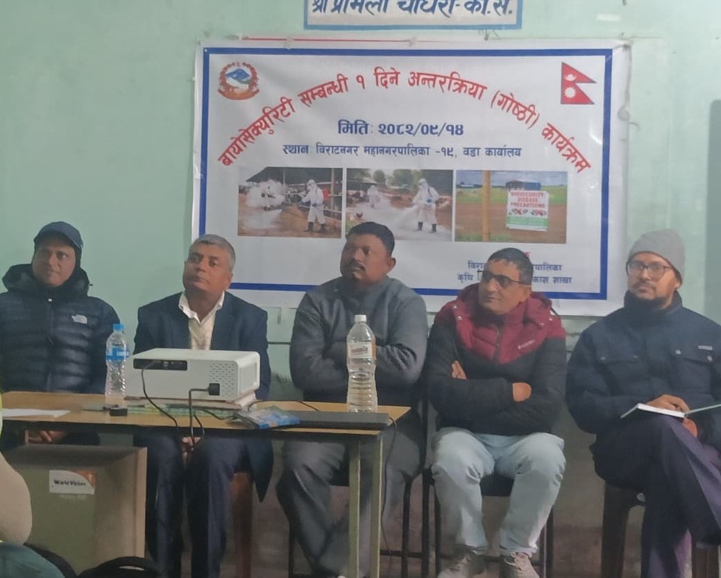 विराटनगर । पशुपालन क्षेत्रको दिगो विकास र रोग नियन्त्रणलाई केन्द्रमा राख्दै विराटनगर महानगरपालिकाले पशु जैविक सुरक्षा (बायोसेक्युरिटी)सम्बन्धी एकदिने अन्तरक्रियागोष्ठी आयोजना गरेको छ । महानगरको कृषितथापशुपंक्षीशाखाको आयोजनामाविराटनगर–१९ मा सम्पन्नगोष्ठीमा बाख्रा, गाईलगायतचौपायामा रोग सर्न नदिनअपनाउनुपर्ने जैविक सुरक्षाकाउपायबारे छलफल गरिएको हो ।